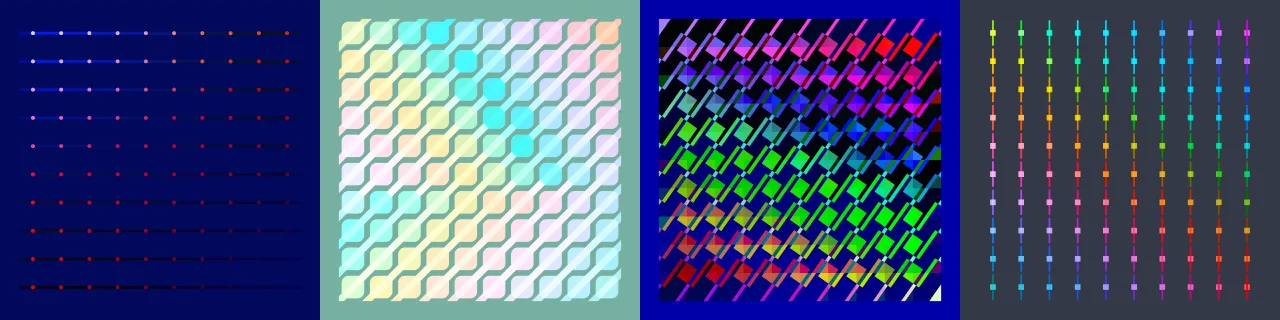 ウィジェットの操作によって、色空間(カラースペース)や色相補間の特性が直感的に把握できるとともに、階層的に並んだカラーが選択した内容によって予想外に変化するのも醍醐味の 1 つです。