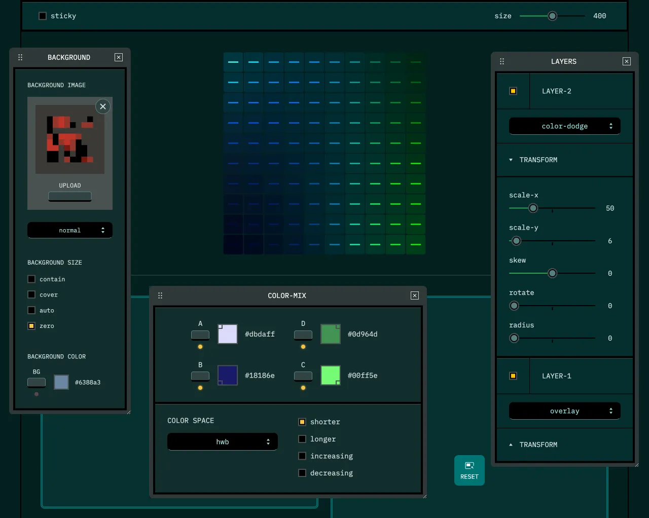 パレット内のスウォッチは 10 x 10 で構成されており、「COLOR-MIX」ウィジェットで指定した 4 つのコーナーの色を起点に、CSS の color-mix() によって 10 段階でブレンドされます。