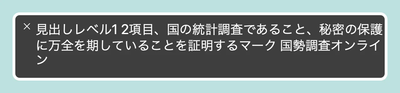 見出し「おわりに」この記事では、国勢調査オンラインのアクセシビリティについて説明しました。網羅的に調査したわけではありませんが、総じてアクセシビリティに重大な欠陥があると感じました56。