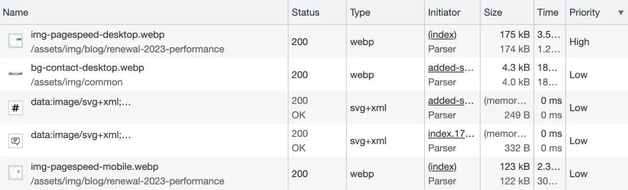 見出し「デベロッパーツールで確認」Chrome のデベロッパーツールの「Network」タブで「Priority」の項目を表示させることで、各要素にどの優先度(Priority)が適用されているかを確認することができます。